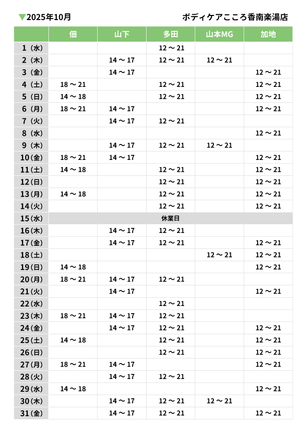 【香南楽湯店】10月シフト表を更新しました
