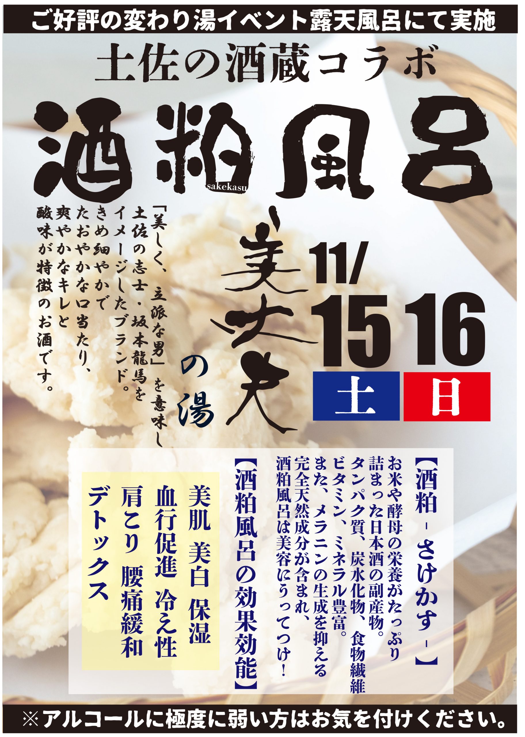 お肌しっとりうるすべ、体もぽかぽか、1度はご体感頂きたい酒粕風呂!!