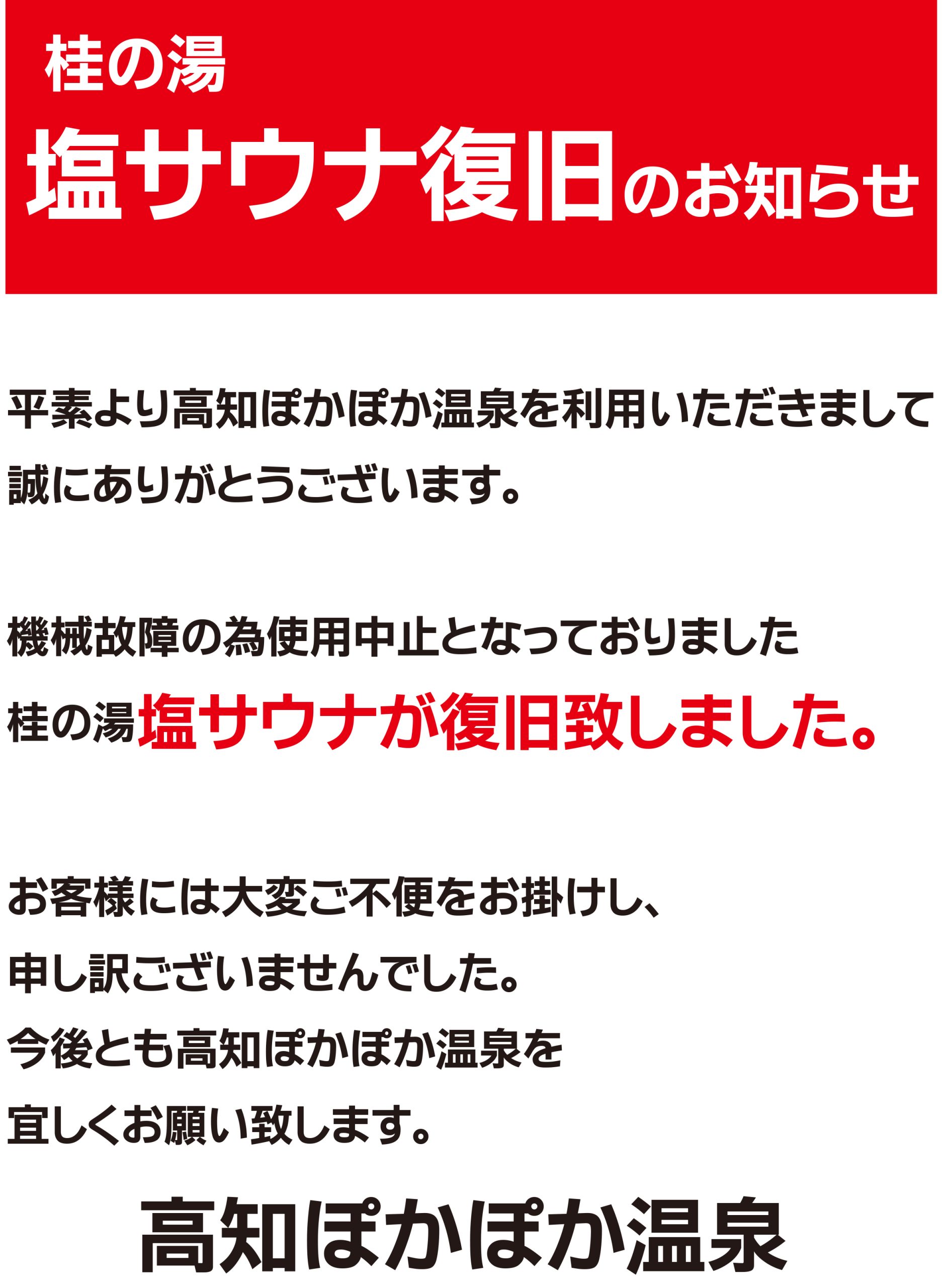 いつも高知ぽかぽか温泉をご利用いただきまして誠にありがとうございます。 機械故障の為使用中止となっておりました桂の湯塩サウナが復旧致しました。 お客様には大変ご不便をお掛けし、申し訳ございませんでした。 今後とも高知ぽかぽか温泉を宜しくお願い致します。 高知ぽかぽか温泉