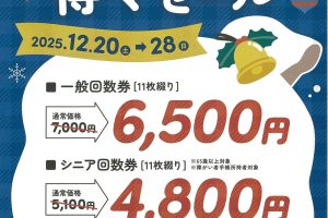 冬の回数券得々セールを下記日程にて開催いたします!12月20日(土)~28日(日)9日間一般回数券(中学生以上64歳まで対象)セール価格⇒6,500円シニア回数券(65歳以上又は障害手帳所持の方対象)セール価格⇒4,800円※価格は税込み※一般、シニアともに回数券は11枚綴り※回数券に有効期限はございません◁拡大はクリックセール期間に合わせてPayPayクーポンご利用いただけます使用条件等をよくお読みの上、ご利用ください