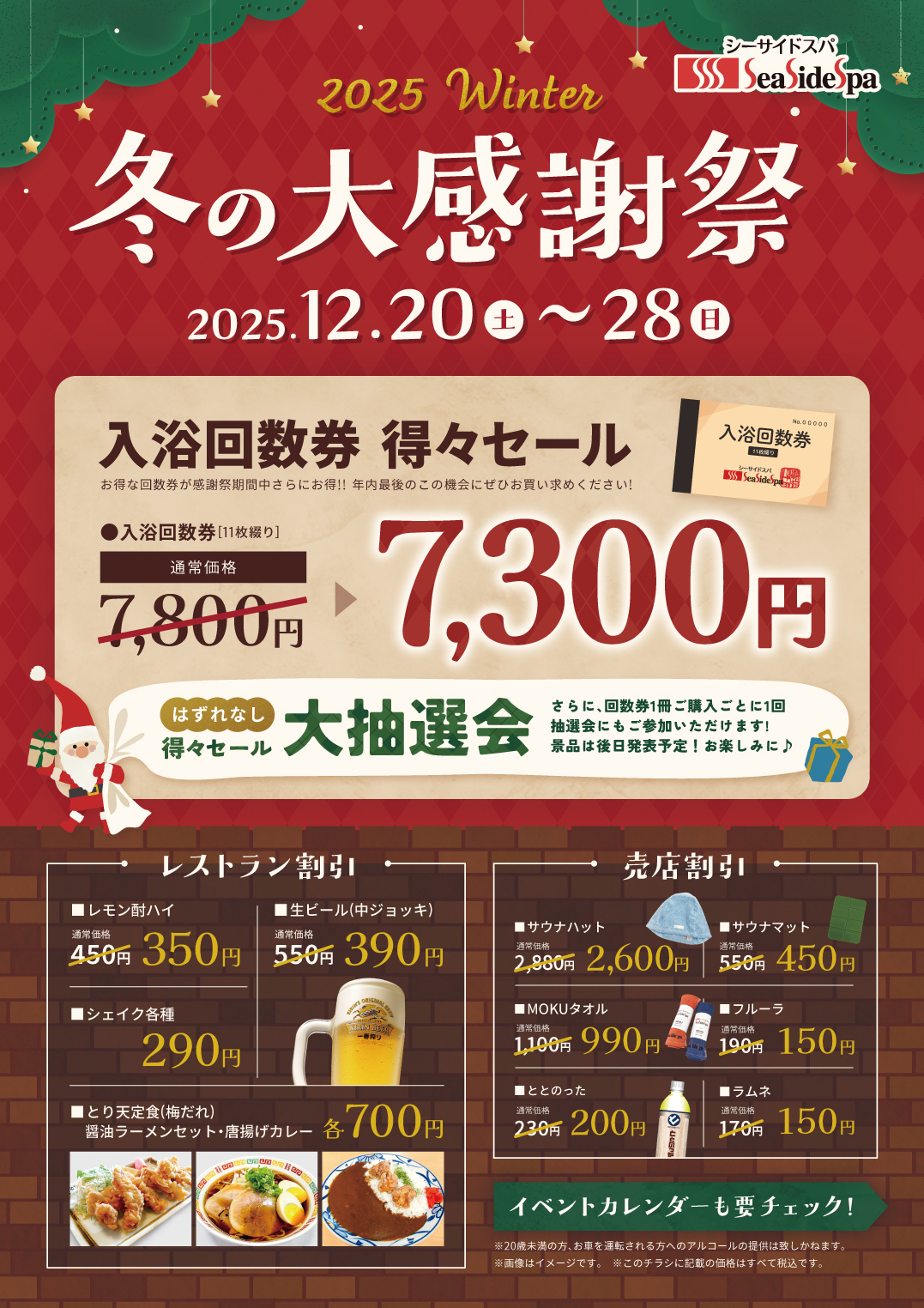 シーサイドスパの冬の大感謝祭が今年も開催決定!体も心も温まるお風呂で冬を乗り切ろう!