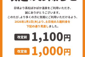 高松ぽかぽか温泉では、下記の期間にお得な回数券を販売致します。期間中のみ販売価格がそのままで通常10枚の所11枚(1枚増量)で販売!お得なこの機会に、ぜひご購入下さいませ!■期間:12/20(土)~12/28(日)9日間■対象:入館回数券9,000円通常10枚▶▶11枚岩盤浴回数券6,000円通常10枚▶▶11枚※使用期限はありません。※フロントレジにてご購入いただけます。※お支払いにつきましては、今回より先払いにて承ります。▲クリック...
