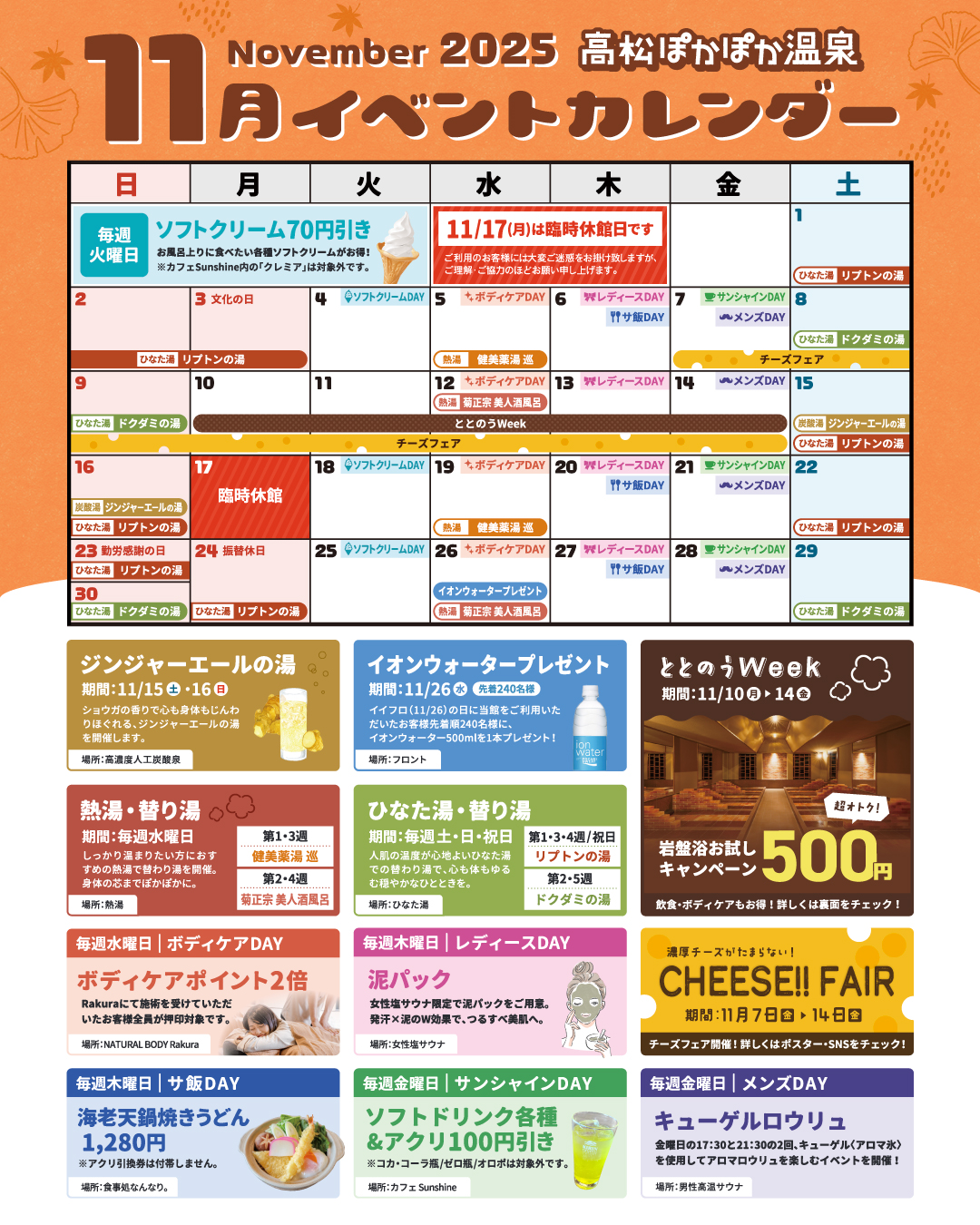 高松ぽかぽか温泉の楽しい11月のイベントカレンダー