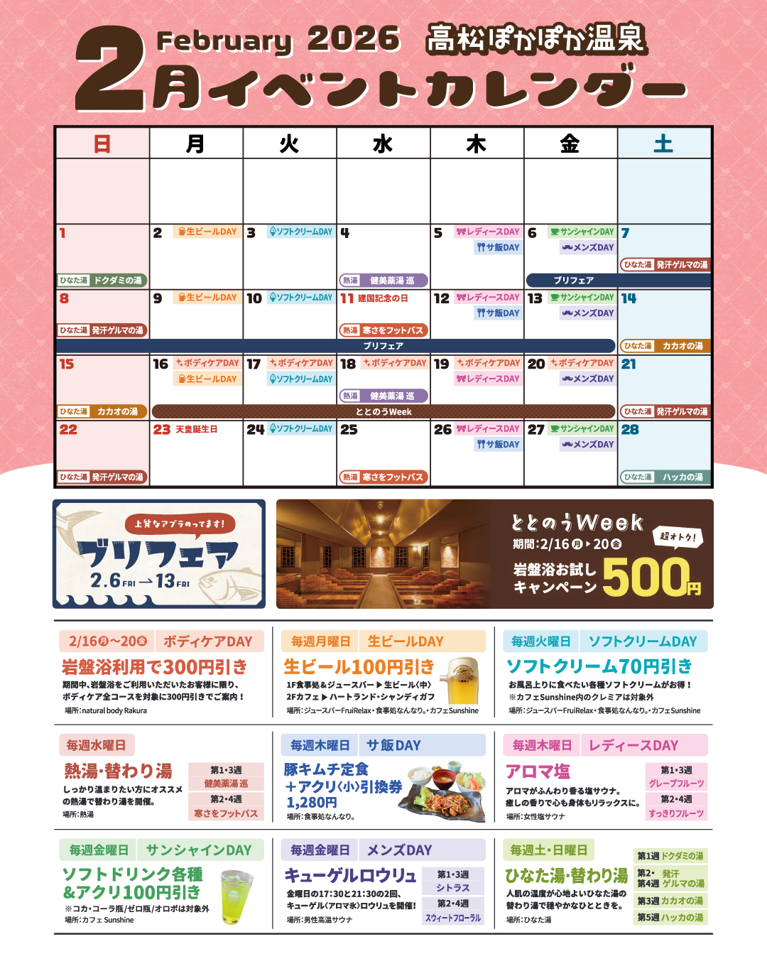 高松ぽかぽか温泉の楽しい2月のイベントカレンダー