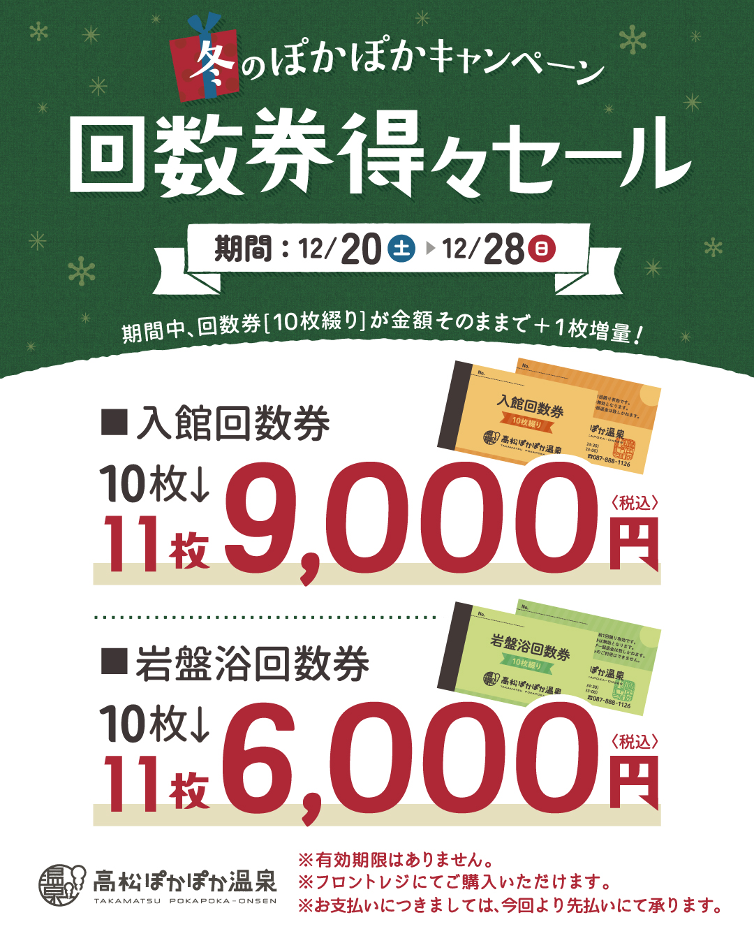 高松ぽかぽか温泉では、下記の期間にお得な回数券を販売致します。