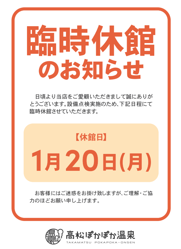 設備点検等実施のため、1/20(月)は臨時休館とさせていただきます。