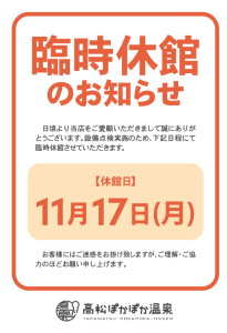 設備点検実施のため下記の日程にて臨時休館させていただきます。