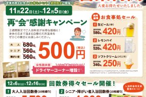 平素より「たかせ天然温泉」をご利用いただき、誠にありがとうございます。このたび、「たかせ天然温泉」は半年間の休業期間を経て、11月22日(土)より営業を再開する運びとなりました。休業期間中はご不便・ご心配をおかけし、心よりお詫び申し上げます。再開にあたり、スタッフ一同これまで以上に皆さまにご満足いただけるサービスの提供に努めてまいります。また、営業再開を記念し、12/5(金)まで大人・シニア・障がい者のお...