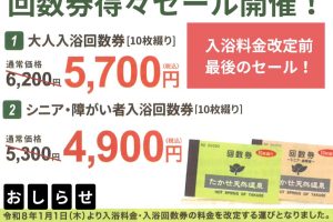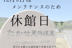 ♨️ たかせ天然温泉からのお知らせ(休館日・イベント) ♨️いつもたかせ天然温泉をご利用いただき、誠にありがとうございます。📅 休館日のお知らせ誠に勝手ながら、2025年12月9日(火) は、設備点検および館内メンテナンスのため、休館日とさせていただきます。ご利用を予定されていたお客様には大変ご迷惑をおかけいたしますが、ご理解とご協力をお願い申し上げます。 休館日: 2025年12月9日(火)🍊 今月の代わり湯とゆず湯イ...