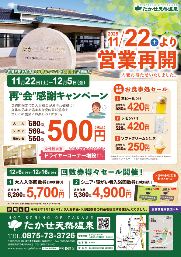 このたび、「たかせ天然温泉」は半年間の休業期間を経て、11月22日(土)より営業を再開する運びとなりました。